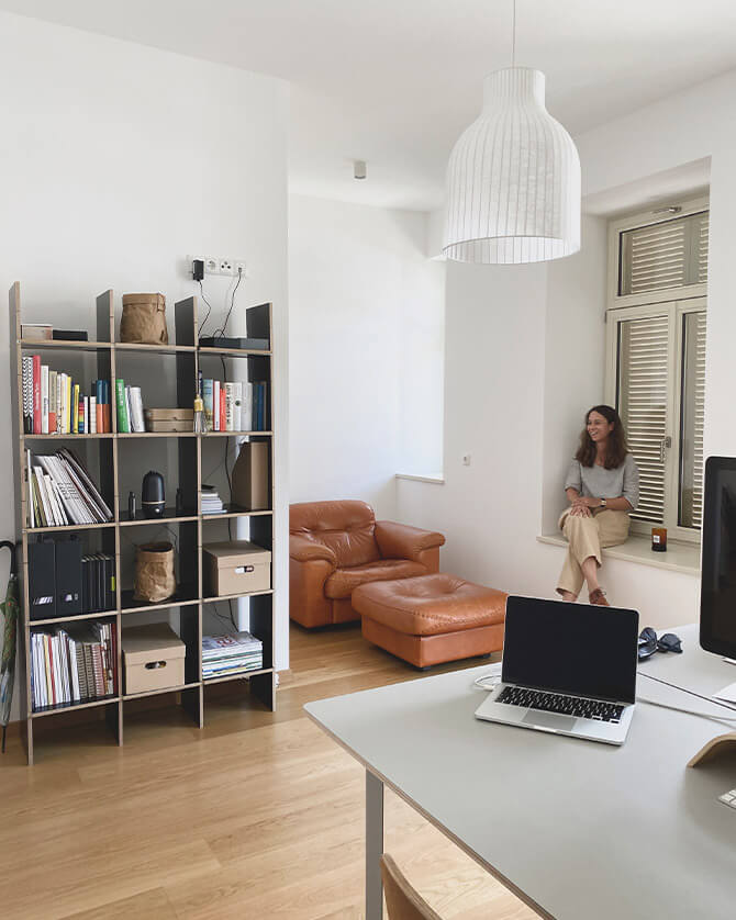 Il soggiorno è usato principalmente come spazio di presentazione per i propri progetti e per riunioni congiunte con clienti e partner di progetto. L'ufficio condiviso è arredato con scrivanie spaziose, un angolo per rilassarsi, il cui pezzo forte è una poltrona in pelle, un vecchio oggetto da collezione di Nina.
